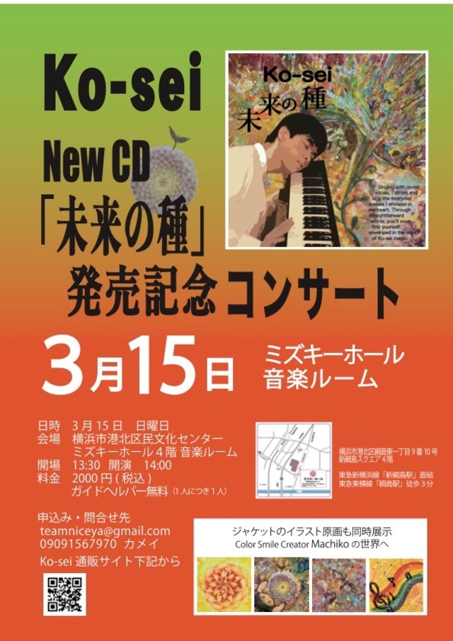 【開放席・追加販売】 New Album【未来の種】発売記念コンサート 日時 3月15日 日曜日 会場 横浜市港北区民文化センター ミズキーホール4階 音楽ルーム 東急新横浜線「新綱島駅」直結 東急東横線「綱島駅」徒歩3分開場 13:30 開演 14:00 料金 2000円(税込) ガイドヘルパー無料(1人につき1人) 紙チケットを発送します
